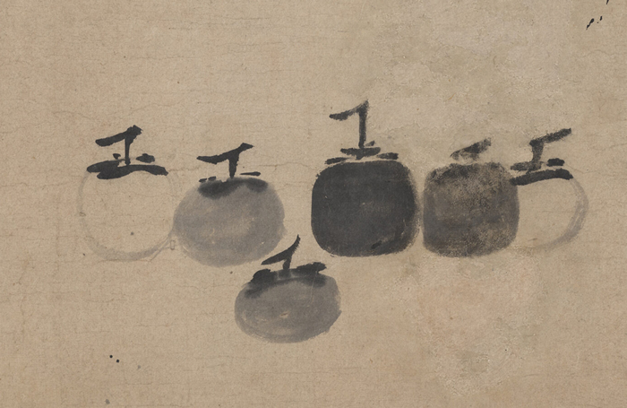 牧溪的畫向來簡約,但一般還有主體和環境的描繪,而《六柿圖》已經到了極簡之境,除了六個柿子,脫離了任何機巧的構圖和環境描寫,淡味至極。但細品之下,又能感受幾分微妙:幾個柿子的排列既有一種秩序又有漫不經心的隨機感,六個柿柄如“工”字形,左低右高;柿子的干濕墨色各不相同,中間一個柿子墨色最重,周邊三個柿子墨色深淺不同,邊側的兩個柿子只簡略地以淡墨勾勒輪廓。