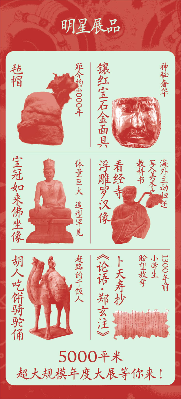 “千年古道,歷久彌新”,為增強中華文明傳播力影響力作出積極的貢獻,舉辦絲路藝術主題的展覽,展示來自千年絲路上的“神秘瑰寶”,更具現實意義。此次展覽以絲綢之路東段沿線,包括敦煌石窟、龍門石窟、云岡石窟、麥積山石窟和克孜爾石窟等宏壯瑰麗、豐潤厚重的石窟藝術在內的各類國寶級文物為超級載體,旨在打造一個內容結構更豐富,品質更高,體驗更完美的年度重量級綜合性文化大展。