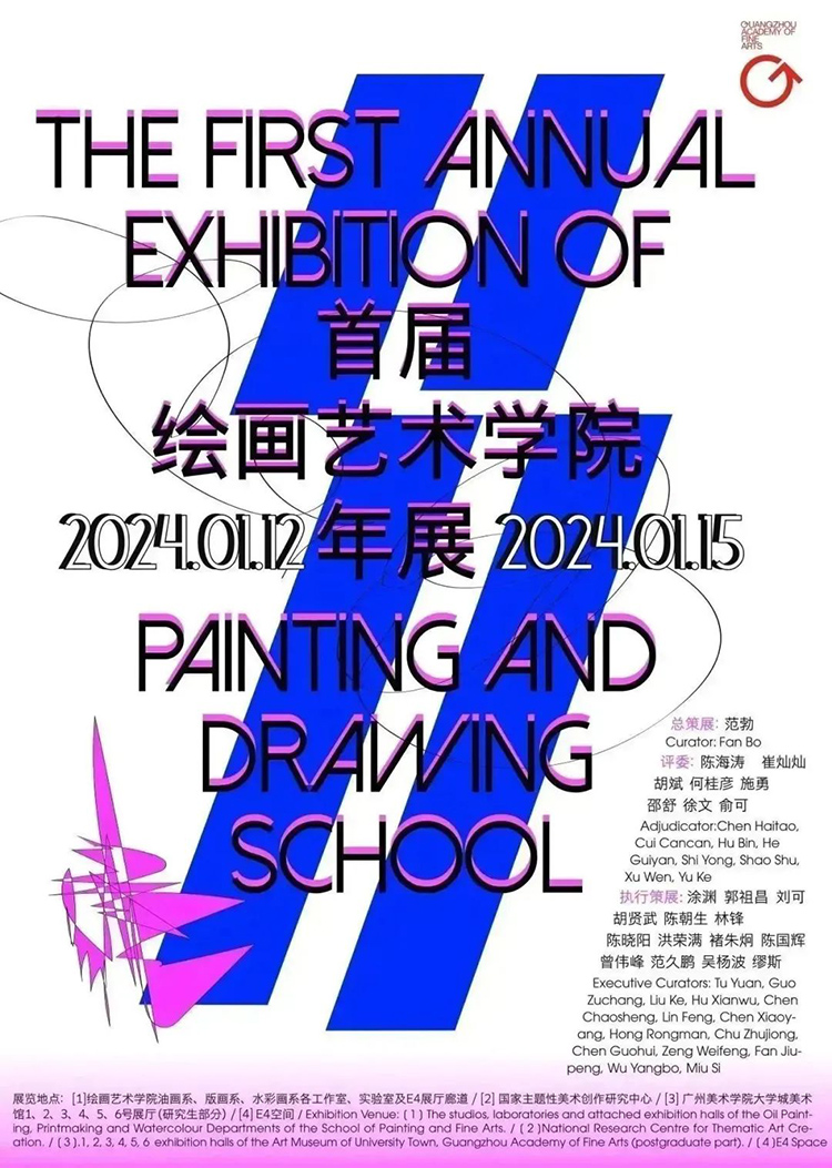 展覽場地:廣州美院繪畫藝術學院大學城校區油畫系、版畫系、水彩畫系各工作室、實驗室、展廳廊道、E4空間;廣州美術學院大學城美術館1至6號展廳;國家主題性美術創作研究中心
