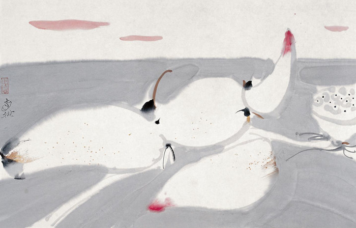 剛才劉先生說這樣的構圖不是技法,但我覺得它是個方法,一說方法,就涉及到具體的畫法,還有繪畫的思路和觀念在里面,融合到一塊。我覺得劉老師解決的,是用他的語匯把傳統中的三維空間與二維平面在構圖中都要解決的問題,在傳統的繪畫當中,就是虛實關系??催@張畫的穿插方式,比較傳統,我說的傳統就是傳統語匯用的多,比如水仙葉子的穿插,這個葉子在前面,后面的葉子就要穿插到后面,有了前后關系,線條就表現的很清晰。這個人物留下這塊白,最后染紅,人物后面再穿插線條,后面再有一個水面,再有天空,一層一層的前后關系,是靠相對比較實的穿插交代。我們看身后這張畫,特別典型,就像我所理解的傳統穿插組合方式,這張畫就特別代表劉老師說的先把重墨畫一遍,有點,可能最后成為石頭,也可能成為花頭上的果實,他先畫重的,由此再生發,由線條再塑造,在慢慢畫的過程中形象就出來了,中間這塊留白,又回到傳統的方式上去,是一個反復虛實相生、相互變化的過程。我想這個繪畫方式用虛實塑造空白跟中國傳統的留白都是相通的。劉先生就以這樣的手法把整個傳統語匯當中的這套規律轉化過來,是很不容易的。