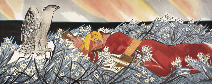看劉先生的畫為什么是音樂性的呢?月光之下的悲愴、抒情,恍兮惚兮,實際上他是解構了形,或者他并不是主觀或者有意識凸顯這個形,他把形消彌在一個大面積的渾沌之中,或者說看似是一種非?!胺拧钡慕嵌热ゾ幣?,但中間,他有大膽鋪設、小心收拾,有形的提示之后,使得作品非常巧妙帶有寓言式的,隱秘暗含了寓言的主題。很多畫都顯現出這一特點,包括對面的《遠去的琴聲》,這把馬頭琴也好,包括睡覺做夢的少女的形象。劉先生這樣的畫,一方面把敘事藏在抒情性里面加以表達,因為你要凸顯敘事性,形和情節非常重要,在我看來,劉先生的畫并不是非常重視情節,情節跟敘事在他來看是消彌在一個大的氛圍之中,大的情緒之中去把它融化掉了,這也是剛才講到構圖,講到傳統山水畫論的“三遠”,“三遠”是構圖嗎?是文藝復興以后的布魯內來斯基的那個“透視”嗎?根本不是,因為在畫論里面,“三遠”里面講的是意境,完全講的是三種意境,不是三個視角,三個物理空間。這樣的話,我們會看到這種方法觀念是什么,把豐富的東西,非常多樣性的東西簡化再簡化,簡化到一種形式,簡化到一個能自圓其說的一種方式來表現,這就是劉先生講到的統一,統一之后,又是時間性、又是空間性的,又是敘事性的又是抒情性的,并行不悖,在并行不悖之中,這里面也有包括劉海粟,從石濤八大的藝術里找到和塞尚梵高高更相通的東西。龐薰琹先生和當時的倪貽德先生的《決瀾社宣言》這里面有很多觀點涉及到這些觀念。