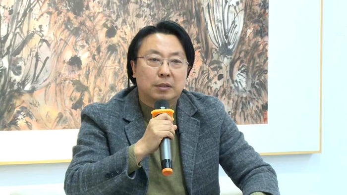 還有一個層面,除了時間觀念就是空間層面,我講的是地域空間,我們從劉先生的畫里面看到的是他對于故園、對于家鄉草原、內蒙草原、大青山,在他的童年記憶,初心記憶里面永遠不變的東西,這個東西是制約或者是決定了一個畫家原初性或者是永恒的非常重要的密碼,今天看了這些畫我又有新的感觸,我跟劉先生說,我去年去包頭,大青山那種空氣、草原的蒼茫、北方山水的感覺,我是東北人,是北方人,我前一段剛去福建,我有非常深的體會,差異太大了。濕度、溫度,草木蔥蓉,整體的氛圍上,我們看劉先生的作品,他畫的大青山又有北方山水,傳統意義上山水干裂清風的東西在里面,又跟傳統的北方的山水,大山大水的傳統又拉開了非常大的距離。他的山水,或者是他的筆下的風景是具有強烈的現代感,一種當代的世態和地域空間的氛圍融合在一起。從這兩個層面來看構圖,實際上這些都是構圖問題,我們今天講構圖、章法,講圖式,其實最終談的是什么呢,是一種畫面的結構,畫面結構既是物理結構,又是畫面最本體的視覺結構,又是心理結構,這也就解釋了劉先生為什么他的構圖,一方面是筆筆相生,帶有非常感性的一面,我們說繪畫味很足。另一方面,他的作品也有他的師輩龐薰琹先生那一代人非常經典性的圖式,或者是那種理性的東西在里面。這是我初步今天也是看悅陽空間,尤其是劉老師2023年這幾件大的作品,我們一會還要談一談,一會談這幾張畫,我先說到這兒。謝謝。