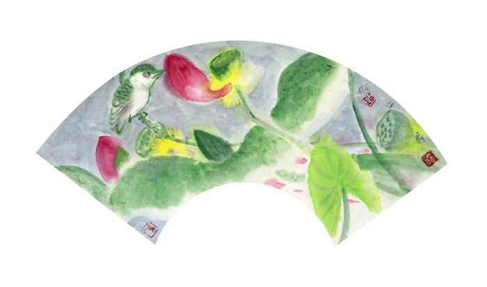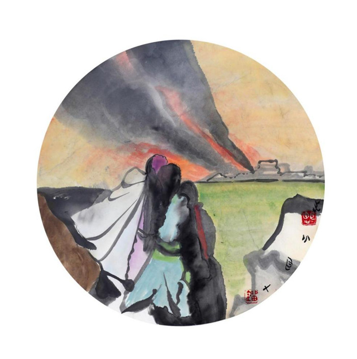 按照劉老師自己的闡釋和表述,我也慢慢理解,劉先生的思想很多是中國傳統思路,是哲學的黑白相生、陰陽轉換,全是從這套體系中出來的,但是他表現出來的是很當代的畫面。涉及到這里面的顏色,看著好像是個日本顏色,很亮,劉先生說我用的是礦物質的真朱砂,是最好的,地道傳統顏色,我問劉先生您不嘗試多用其他顏色,劉先生的回答是“跟墨最相配的就是我們傳統的中國畫里的中國顏色?!彼桶堰@套體系,看上去很現代,是新圖式的創造,但你究它的根源還是傳統民族之路的根源。涉及到從構圖角度看劉先生的具體畫法,再談到劉先生創作的思路和藝術之路,劉老師經常談到龐薰琹先生和吳冠中先生,我覺得這還是以東方的民族藝術為根本的融匯中西文化、中西語匯的一條民族藝術之路。我是這么理解的。