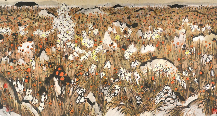 在劉先生的畫里面,他要把這么多的豐富性的東西要融化在他的畫里面,包括我背后的《追日草》,這無疑是整個展覽里面最點題的一幅作品。它非常的豐富,像一闕交響樂,按照劉先生的話來講,他不是一個一個畫,是一片一片的畫,是同時生長,一下子涌來,這樣的情感的表達是中國傳統意境,是音樂性的,這種音樂性又結合了西方的經典音樂的復調,還不是古琴的單線結構。