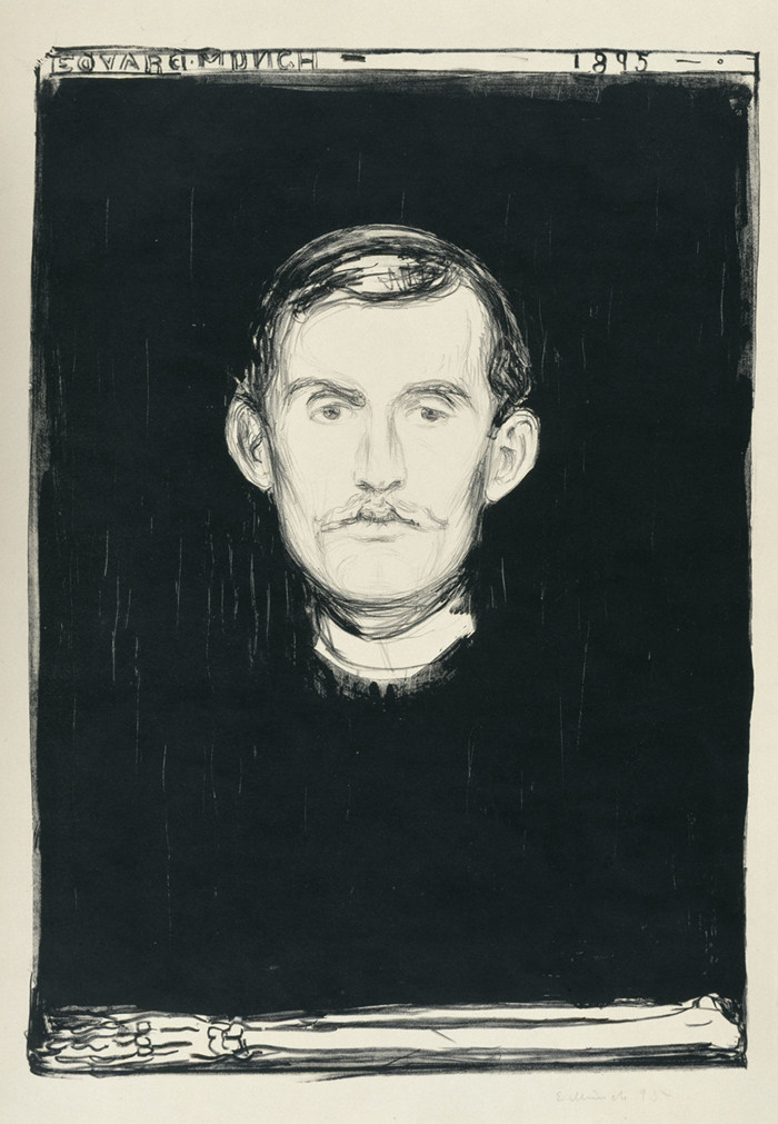 同他所欣賞的梵高一樣,蒙克也是個愛拿自己當模特的畫家。除了油畫作品,柏林紀念特展上還有一幅蒙克的石版畫自畫像。蒙克的版畫技能同樣是在搬到柏林后新開發出來的,從1894年開始,蒙克自學蝕刻版畫(etching)與石版畫(lithography),很快便熟練掌握并達到精湛。