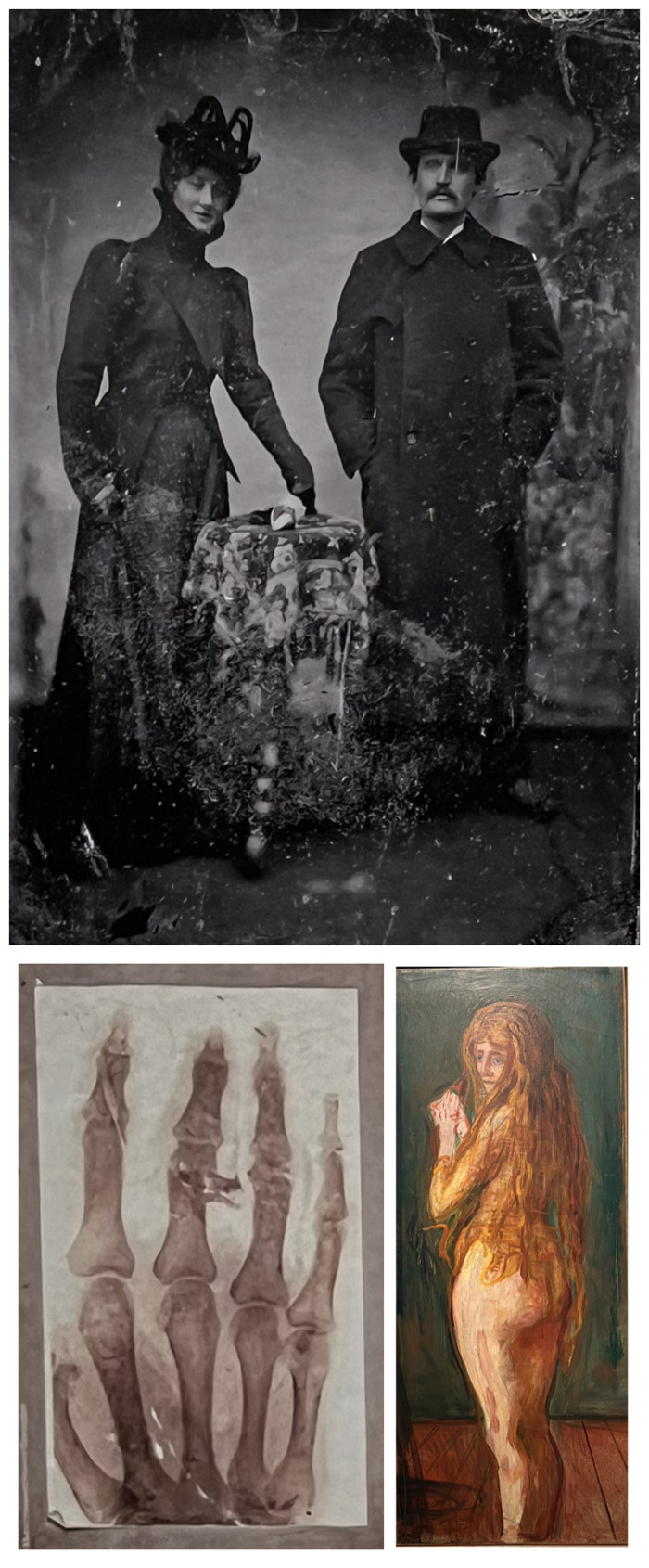 上圖:蒙克與“塔拉”(Mathilde Larsen,1869-1942),約1899年,翻拍自柏林紀念特展現場;左下:蒙克左手中彈后的X光片,1902年,翻拍自柏林紀念特展現場;右下:《紅發裸女》(Nude with Long Red Hair),蒙克,油畫,1902,挪威蒙克美術館藏品