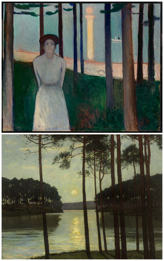 上圖*:《聲音(夏夜之夢)》,蒙克,1893,波士頓美術館藏品;下圖:《施拉赫滕湖之夜》,瓦爾特·萊斯蒂科(1865-1908),約1895,柏林城市博物館基金會藏品