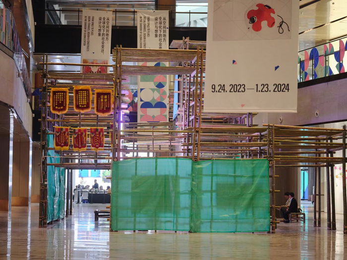 竹子,是這個展覽的核心材料,核心意象。鄭州一帶不是產竹的地方,從運輸和可持續發展的角度看,可能不是那么因地制宜,但在一個光滑硬朗的現代商場搭建竹城寨,這種突如其來的戲劇反差,非常契合展覽要表達的主題調性——這是一個前現代和后現代混搭而成的超現實主義迷宮,上面掛滿錦旗——那是樂迷送給大時代歌廳演唱會的錦旗——上面寫著五條人的歌詞和語錄——把一個“未完成”的工地變成嘉年華。