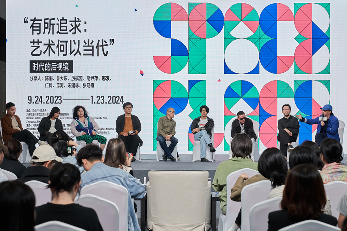 “從空間到地方”展覽開幕日論壇“有所追求:藝術何以當代”(從左至右分別是參展藝術家鄔浪、厲檳源、胡尹萍、魯大東、陳侗、仁科、茂濤、朱建林、以及策展人張曉舟),2023年9月,詩山河·陸之舟,攝影:波妮