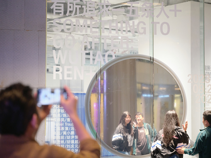 觀眾與“有所追求:五條人+”主展廳入口處的“后視鏡”拍照留念,2023年9月,詩山河·陸之舟,攝影:朱銳