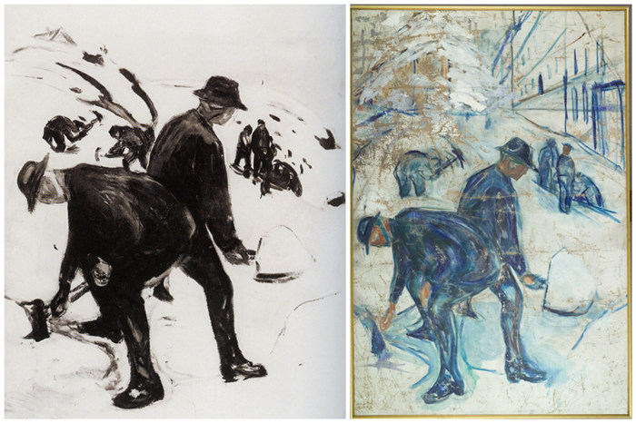 蒙克,左圖*:《鏟雪者》,1913-1914,曾為德國國家美術館藏品,已被毀;右圖:《建筑旁的鏟雪者》,1931-1933,挪威蒙克美術館藏品