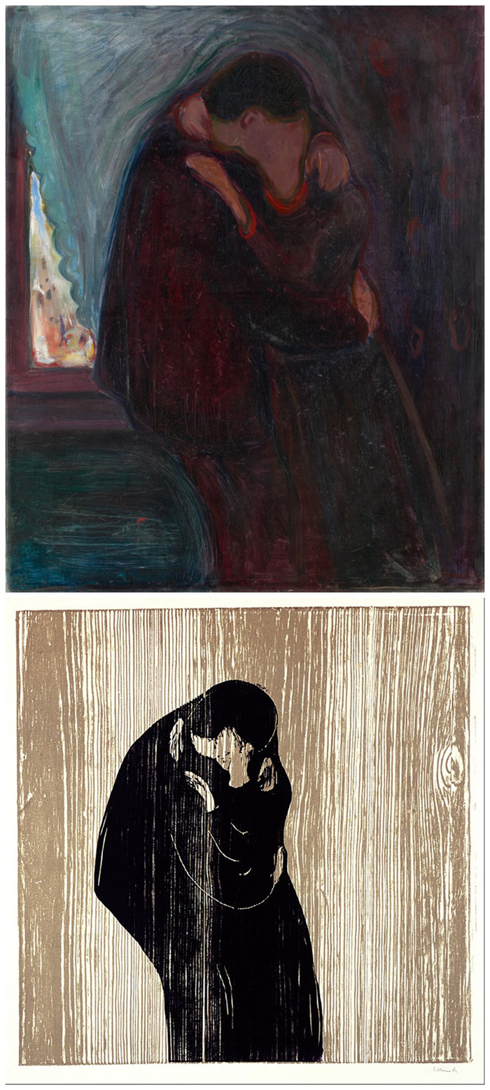 蒙克,《吻》,挪威蒙克美術館藏品,上圖:1897;下圖:1902,彩色木刻版畫