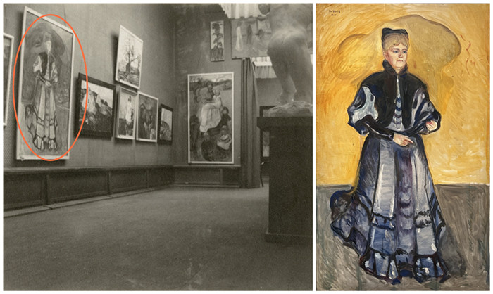左圖:1907年,《伊莉莎白·弗爾斯特爾·尼采肖像》在保羅·卡西爾畫廊的蒙克展覽上展出。右圖:《伊莉莎白·弗爾斯特爾·尼采肖像》,蒙克,1906,蒙克美術館藏品