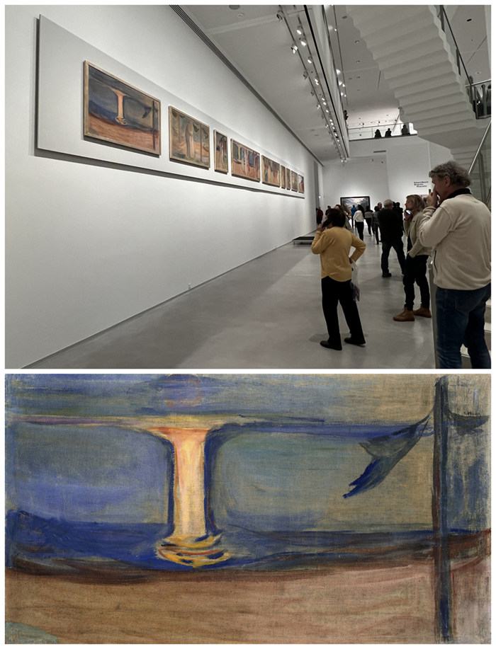 上圖:2024年“愛德華·蒙克:北境魔魅”柏林紀念特展現場的“萊因哈特飾帶”;下圖:“萊因哈特飾帶”之《海上月光》(,蒙克,1906-1907,蛋彩畫,柏林國家博物館之老國家畫廊藏品