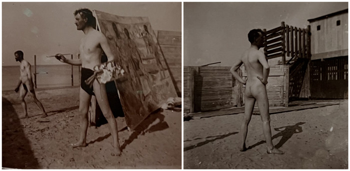1907年,蒙克于德國海灘創作時留下的兩張自拍像(翻拍于紀念特展現場)