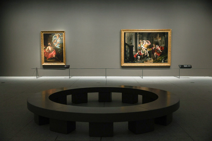 整個展覽空間的展陳配合巴洛克風格帶來了特別的設計。首先在光線上向卡拉瓦喬致敬——作為使用光線明暗塑造畫面戲劇感的大師,卡拉瓦喬大量運用深色來創造陰影區域,再通過明亮的顏色以凸顯畫布上的焦點。他就像一位導演,用聚光燈將觀眾的目光引導到畫中故事的情節高潮處,人物在昏暗的舞臺布景中脫穎而出。憑借這片光影,畫中人物的豐富情緒讓畫外的觀者感同身受。隨著參觀者在展覽中的不斷深入,燈光亮度會逐漸降低,直到最后一個展示卡拉瓦喬作品的展廳。受這些作品最初在燭光下觀賞的啟發,該展廳的燈光亮度會非常低,從而增強其戲劇性,為站在卡拉瓦喬的畫作前的觀眾帶來一種身臨其境的感覺。