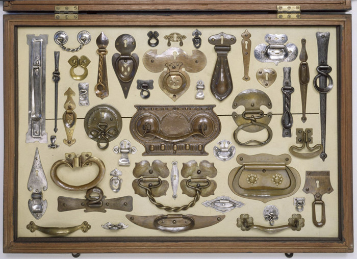 家具配件樣品展板 設計/制造:理查德·盧埃林·本森·拉斯伯恩 利物浦,約1900-1906年 銅,黃銅,電鍍品,木制展框 38.3×56.2×5.5 cm 維多利亞與艾爾伯特博物館藏 馬克·伯克特 捐贈