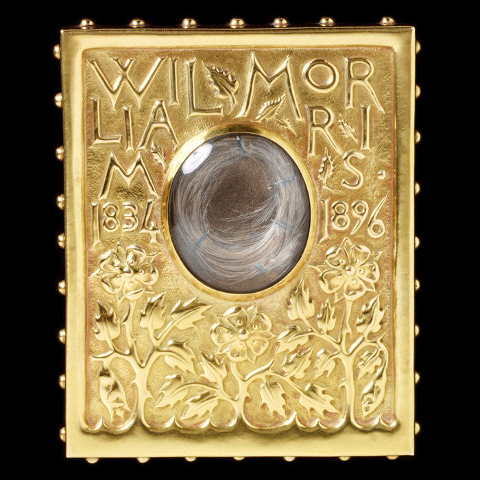 金盒 設計/ 雕刻:羅伯特·卡特森-史密斯 制作:查爾斯·詹姆斯·??怂梗▊鳎?896-1897年 金,水晶,木材,絲絨,頭發 10.1cm×8.2cm×1.6cm 維多利亞與艾爾伯特博物館藏 梅·莫里斯遺贈