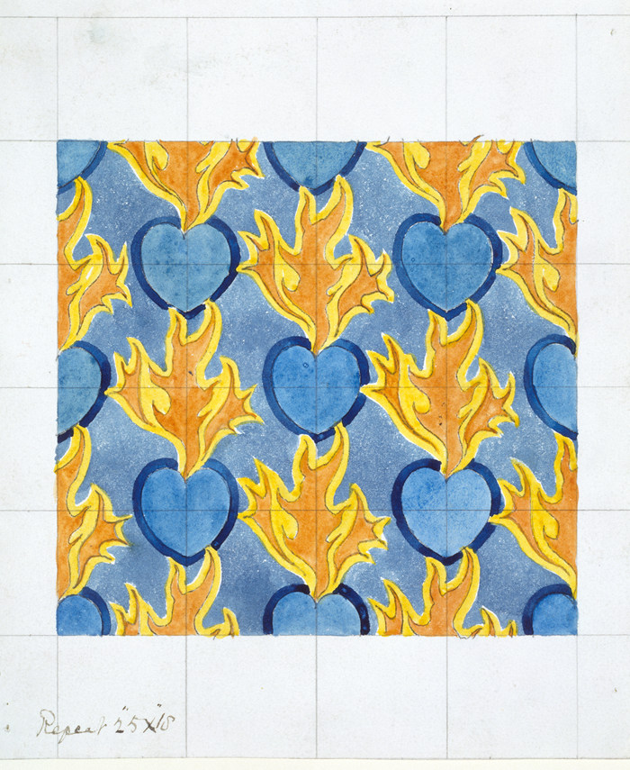 燃燒的心(紡織設計圖)設計師:C.F.A.沃塞 1918年 紙本鉛筆、水彩 40.1cm×27.2cm 維多利亞與艾爾伯特博物館藏 考陶爾茲有限公司捐贈