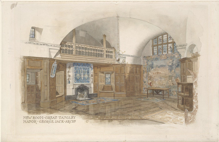 大坦格利莊園客廳設計圖 設計:喬治·杰克 莫里斯公司 約1902年制造 紙本鉛筆、水彩 41.9cm×57.1cm 維多利亞與艾爾伯特博物館藏