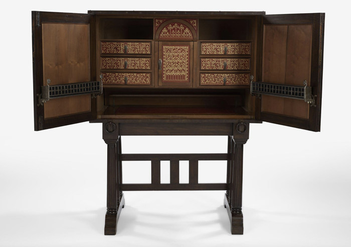 櫥柜式寫字桌 設計:C.R.阿什比 生產:手工藝行會 木匠:J.W.皮門特;W.W.賴德 皮匠:阿納斯塔西婭·鮑爾 產自奇平卡姆登,1904-1905年 胡桃木(底座),美國梧桐(框架),雪松(抽屜),摩洛哥羊皮革,拋光鐵件 143×107×64 cm 維多利亞與艾爾伯特博物館藏