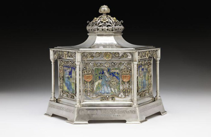 首飾盒 設計:理查德·喬治·哈頓 銀匠:拉爾夫·布徹 琺瑯師:伊麗莎白·戴維斯,埃莉諾·斯萊特 參與制作:路易莎·迪克森,希爾達·哈爾沃森,瑪麗·巴伯,艾米·狄金森,愛麗絲·阿姆斯,路易絲·戴維斯,伊娃·巴伯,伊麗莎白·馬奇班克,雷內·鮑曼等人 為紐卡斯爾手工藝品公司制作 泰因河畔紐卡斯爾制造,1906-1907年 銀,金,琺瑯,寶石,珍珠,蛋白石,鍍銀線 23×25 cm 維多利亞與艾爾伯特博物館藏