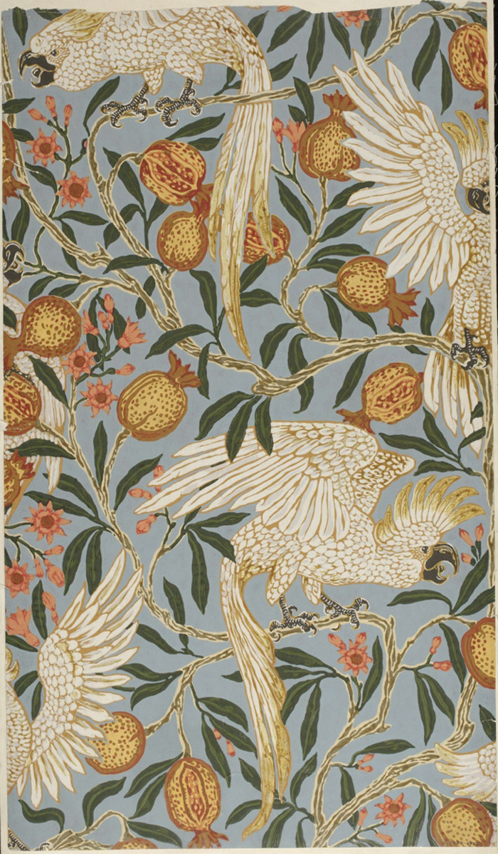 鳳頭鸚鵡和石榴(壁紙)設計:沃爾特·克蘭 杰弗里公司 倫敦,1899年 紙本彩色木版印刷 89cm×51.5cm 維多利亞與艾爾伯特博物館藏 哈里斯父子捐贈