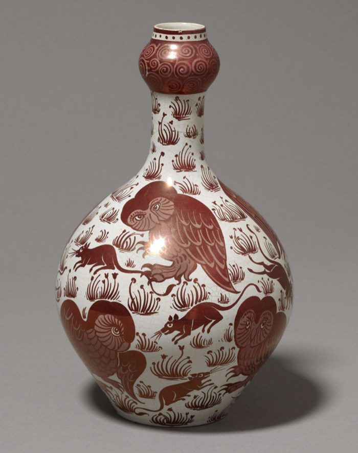貓頭鷹蒜頭瓶 設計:威廉·德·摩根 威廉·德·摩根公司 倫敦,1888-1898年 虹彩陶器 30cm×17cm 維多利亞與艾爾伯特博物館藏 R.S.休斯女士捐贈