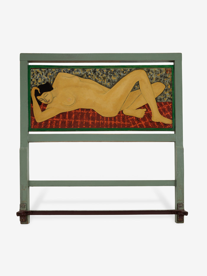 床 設計/ 繪制:羅杰·弗萊 制作/ 經銷:歐米茄工坊 合作企業:富豪 倫敦 1915-1916 年 白樺木,油漆,鑄鐵 床頭板長:117cm 床身尺寸:201cm×166cm 維多利亞與艾爾伯特博物館藏 F.C.O.斯派爾女士遺贈