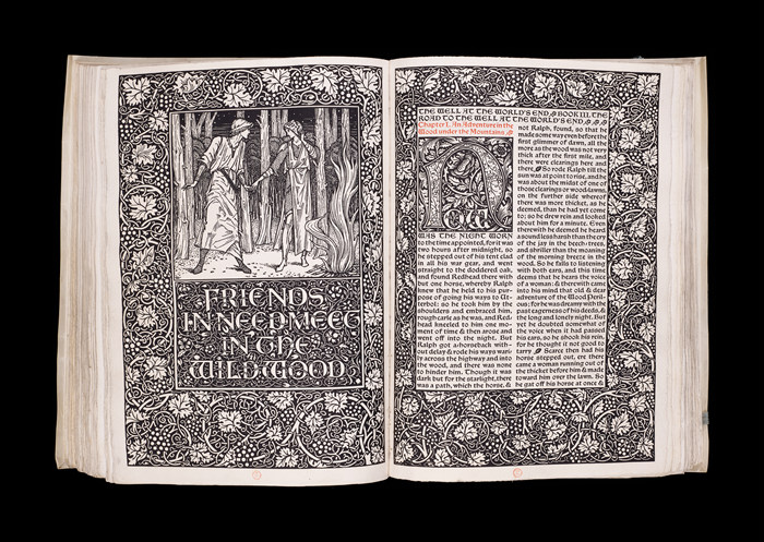 《世界盡頭的井》作者/ 設計:威廉·莫里斯 插畫:愛德華·科利·伯恩-瓊斯 出版:凱爾姆斯科特出版社,倫敦,1896年 紙本木版印刷, 羊皮紙, 絲帶 30cm×22.5cm×6cm 維多利亞與艾爾伯特博物館藏