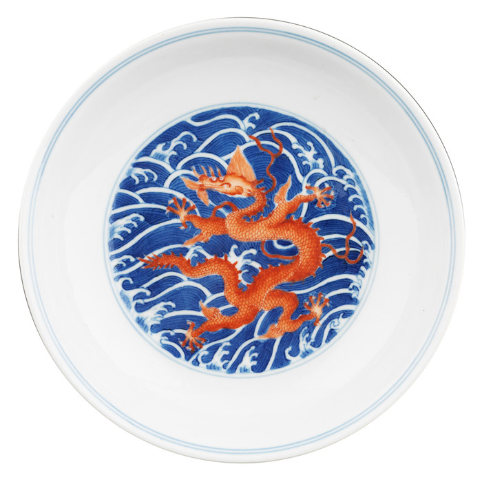 (清)道光款青花加紅龍紋瓷盤 高4.1cm,口徑17.5cm,足徑10.6cm 清華大學藝術博物館藏