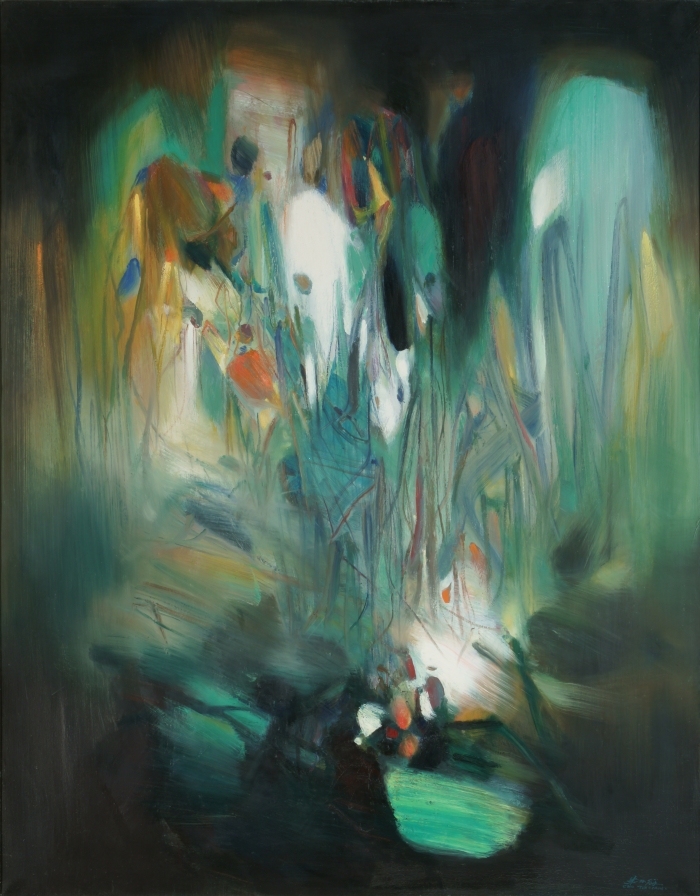 朱德群是行動抽象(gestural abstract)史上的重要代表人物。他的繪畫作品來自于與畫布表面的感性、未經預先考慮的對抗。星云和漩渦出現了,它們復雜的多色是由強大的明暗效果形成的,沒有求助于浮雕或厚涂,并系統地拒絕幾何形狀。他的空間,超出了畫布的尺度,是一個流動的矩陣,我們的視覺被投射和沉浸其中,導致我們失去所有的空間和語義參考點。