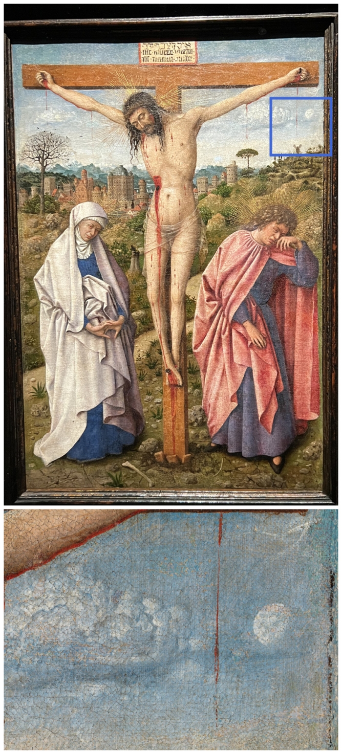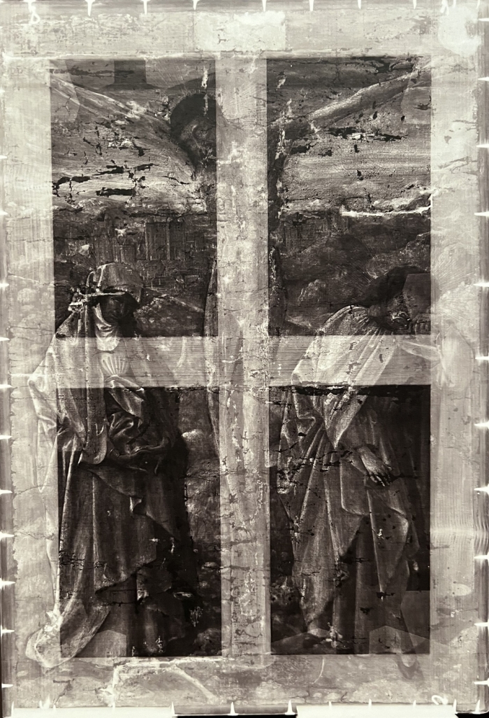 如果《耶穌受難》真是揚?凡?艾克的手筆,那么將是他唯一幸存的布面油畫。而且根據研究顯示,這幅畫竟然是從板面轉移到布面上的。這項高風險的轉移操作需要將原先的木板完全從作品背面移開,再將超薄的畫層重新安置于布面上,X光線攝影顯示出畫布中的裂紋和折痕,這些都是很典型的由于畫布曾經被卷起存放而形成的損壞。