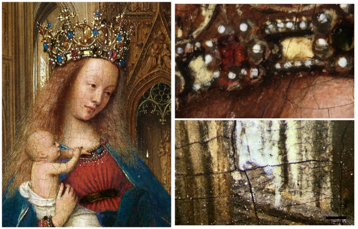 在《教堂圣母子》中,揚?凡?艾克僅靠顏料就創作出了圣母金冠上珍珠和寶石的光芒。不過研究人員通過立體顯微鏡檢測,發現窗戶附近的光區使用了銀箔,這一復雜運用應該是源自另一項古老技術。