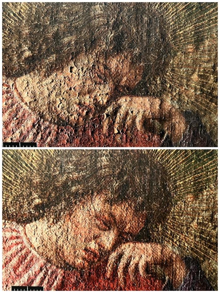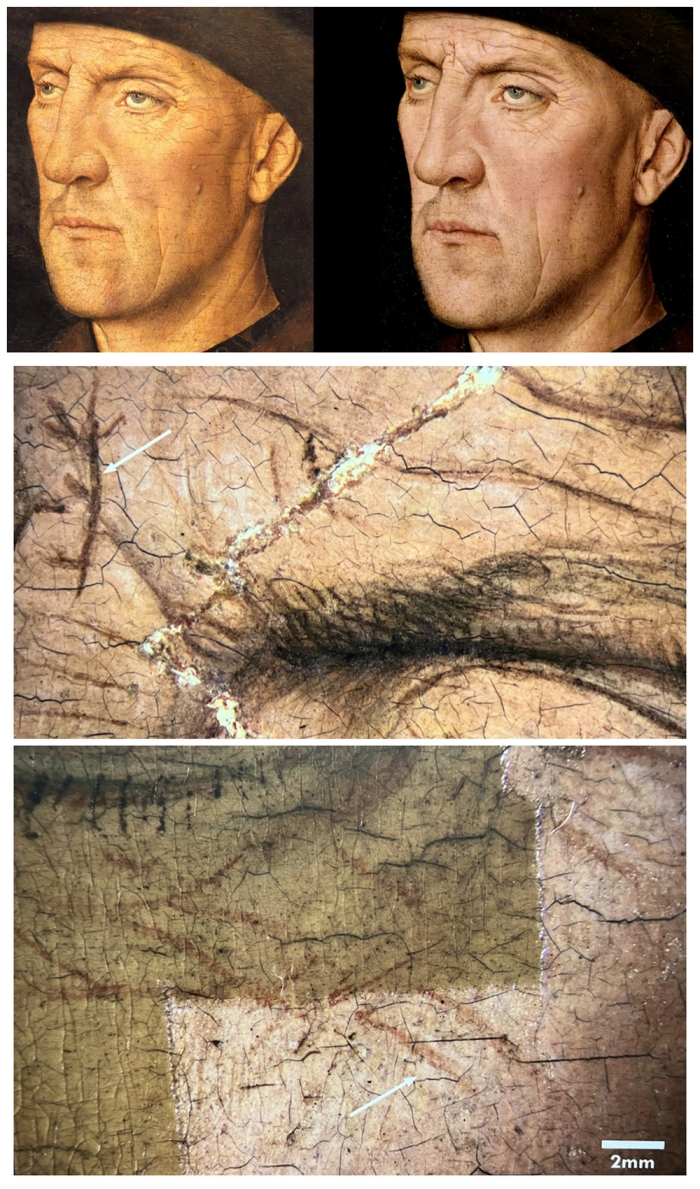 中圖:白色剪頭指向鼻子山根的疤痕;下圖:去除清漆后,眼部區域的皺紋細節重現
