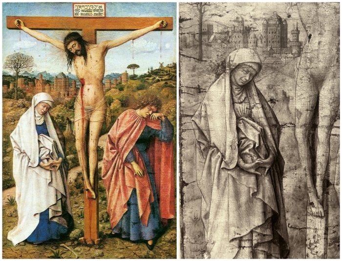 左圖:《耶穌受難》(The Crucifixion),揚?凡?艾克工作室,約1430/40,布面油畫;右圖:紅外線反射映像下的局部細節