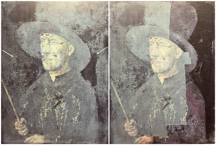 左圖:白色剪頭指向紫外線檢測下的陳年重繪顯示;右圖:紫外線檢測對比圖,左側為清漆去除前,右側為清漆去除后