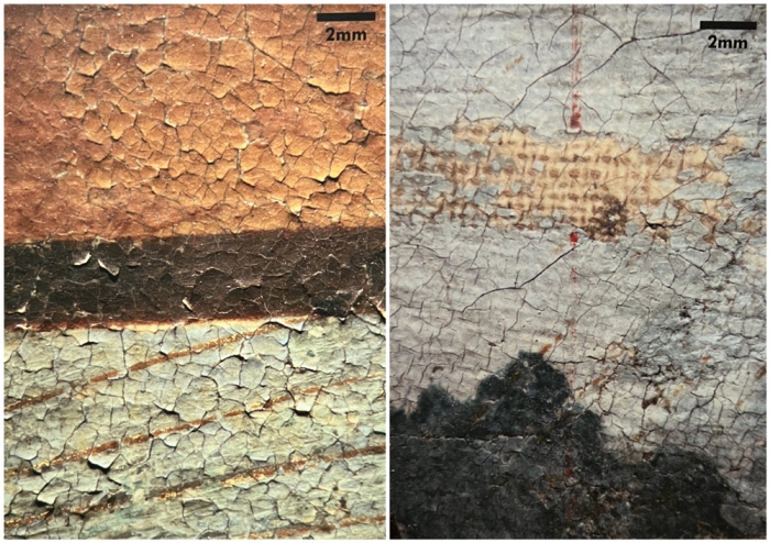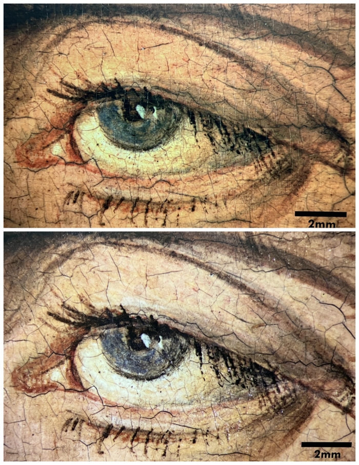 通過初步檢查,研究人員發現顏料層之上至少有五層凡尼斯,只有面部區域的凡尼斯層在早期修護時被移除過。而在這些凡尼斯層中,又能看到來自三個不同時期修護時留下的大范圍潤飾痕跡。另外,板面油畫因為是在木材上作畫,在漫長的歲月中,溫度和濕度會引發木板出現膨脹、收縮等變化,顏料層因而會跟著板面的變化出現浮起、龜裂、剝落等狀況。