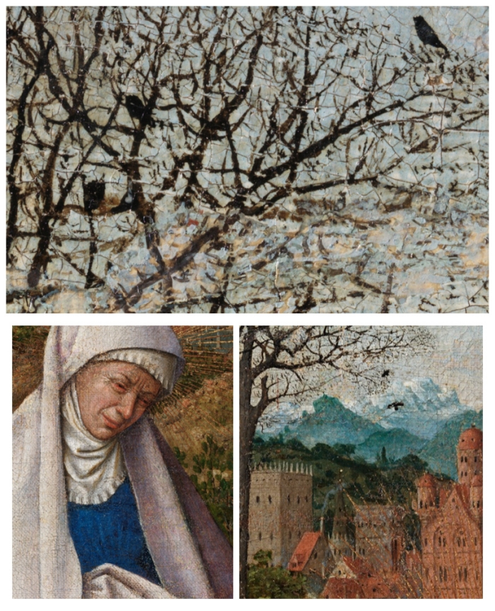 上圖:濕畫法區域(畫面左側樹與群鴉);下圖:圣母與群山的藍色對比
