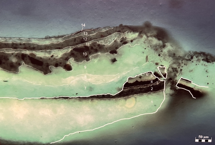 紫外線檢測顯示圖,1-6為原始顏料層,7-14為后人添加的清漆及重繪部分