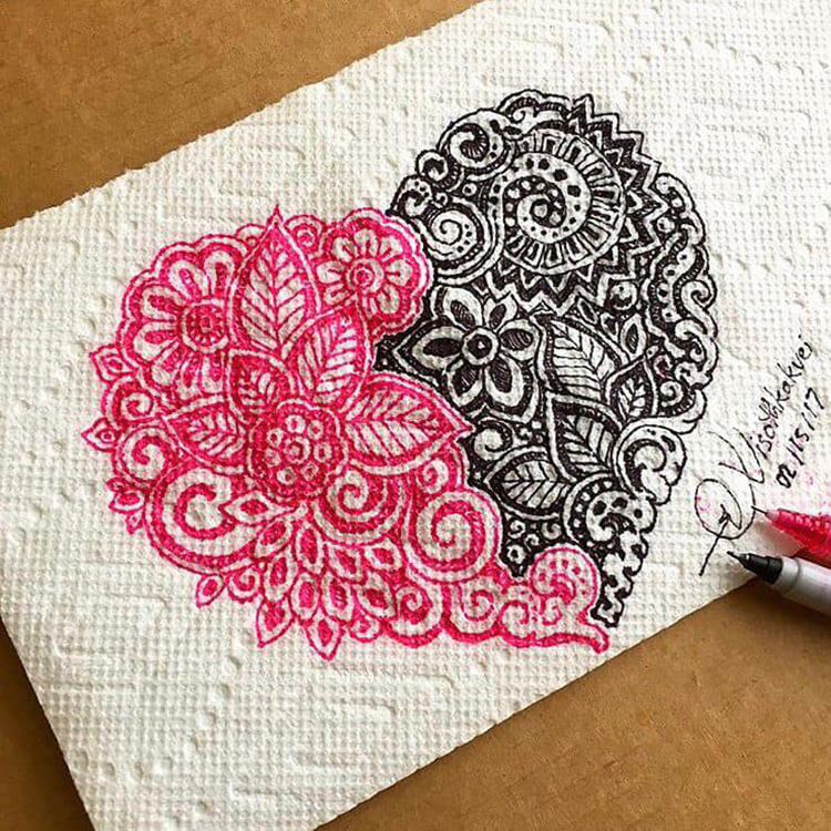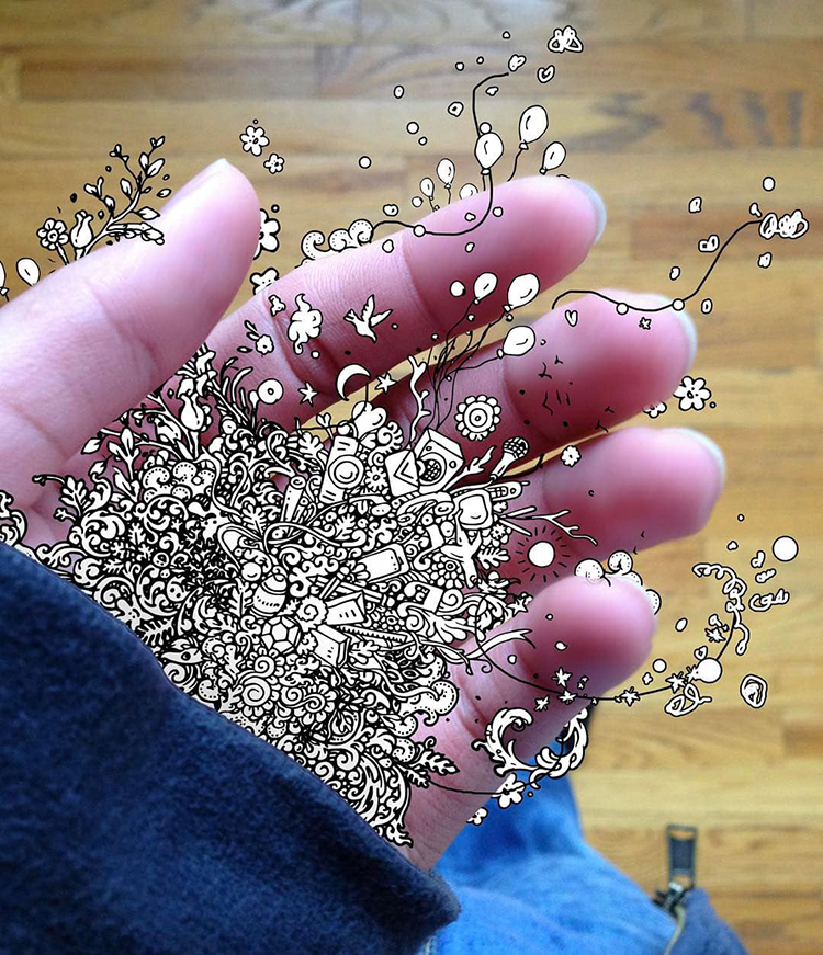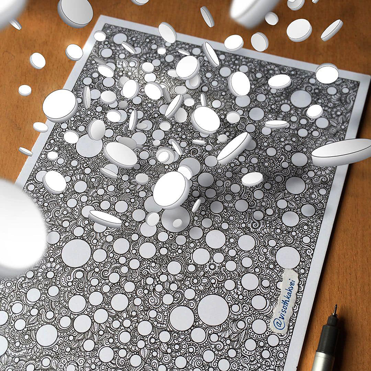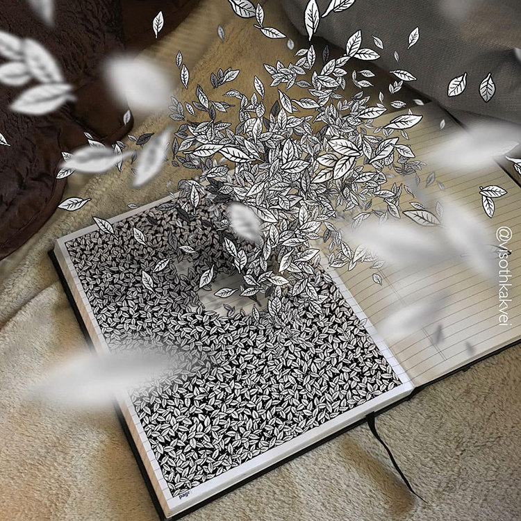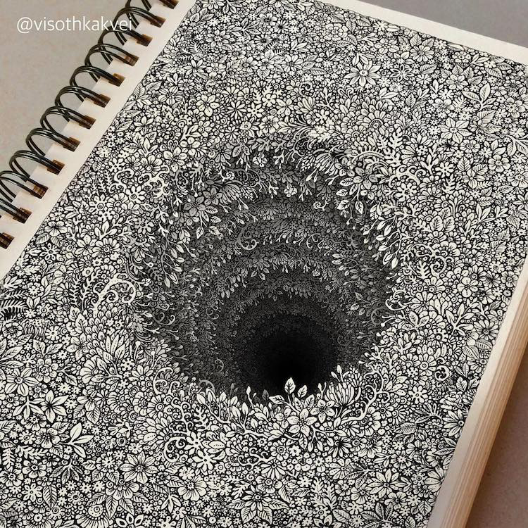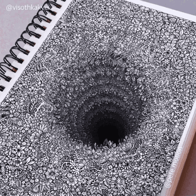 這位藝術家是90后,年輕有朝氣,有手頭功夫更有想象力。跟Maxwell Tilse一樣,這位藝術家也是使用針管筆作畫,但跟前者不同的是,他的畫更加立體,仿佛突破了二維空間限制一樣,比如直接給平面的紙張畫出個大洞來: