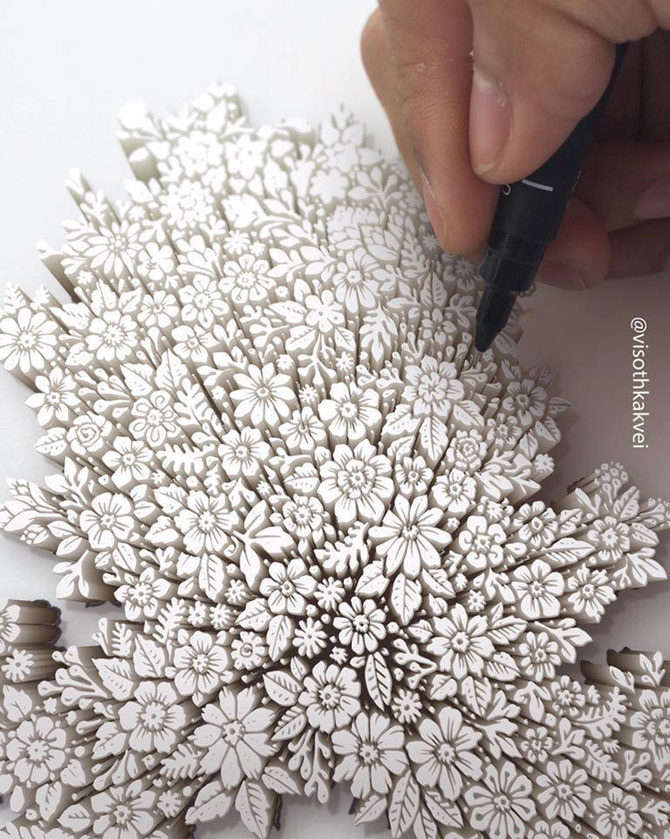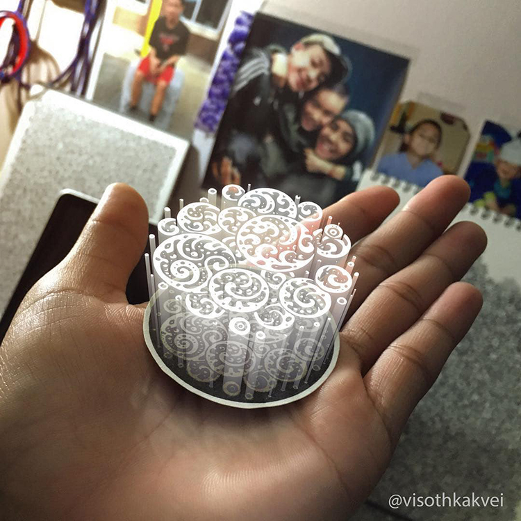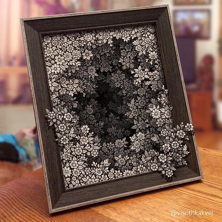 再后來,為了提升作品創作的難度以及讓畫作更有立體感,Visoth Kakve學習了很多電腦繪圖軟件。本就精致的畫作再加上電腦ps處理,如虎添翼,二維秒變三維: