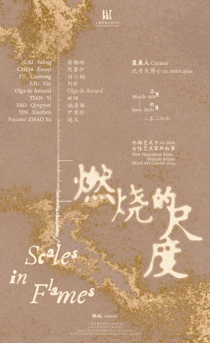 本次展覽邀請了當下具有前沿視野與獨特生命經驗的女性藝術家,一同展開新敘事。燃燒的尺度意味著,重新建立認知的框架,重新丈量世界。陳蕭伊以數百張衛星地圖拼成橫斷山地區俯視圖,她以圖像技術與其中的時間哲學來構建更宏大的感知。Olga de Amaral在金箔與布料中重構了民族史。田翊轉譯了身體的密碼,在基因折射中形成了新的存在狀態。