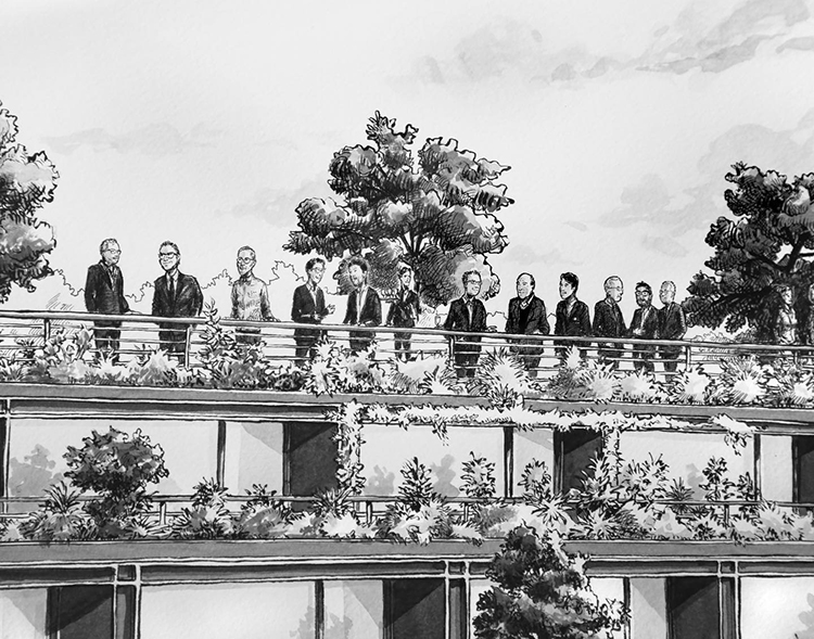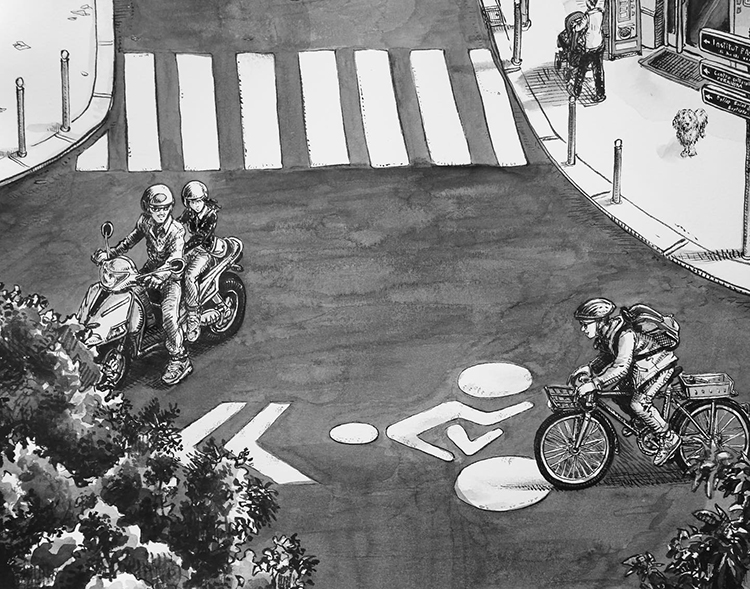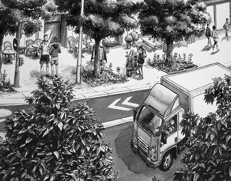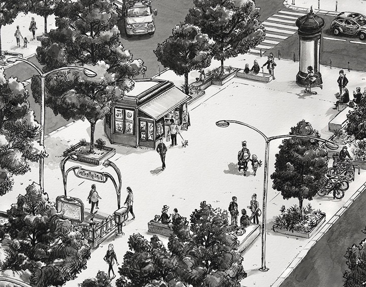 第一眼看到Thomas Dartigues的作品時,可能第一感受就是密集,作品布滿了黑白細線。但仔細看時又能發現,每一處小細節都會被認真對待,這些小細節呈現出一個個鮮活有趣的生活場景:
