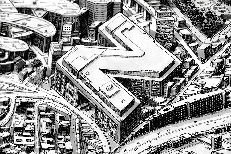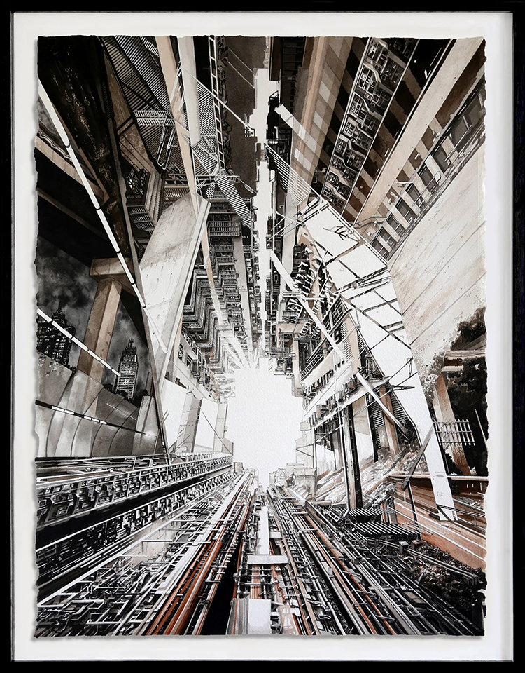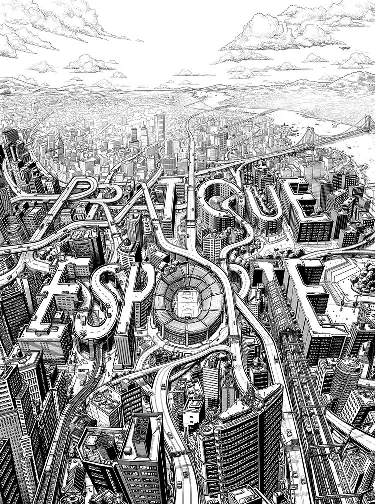 Thomas Dartigues在描繪城市景觀時不只是純記錄,更多的是基于現實進行設計后再創作。所以他的作品很多建筑突破物理常規,天馬行空,但又好像合情合理。比如他受New Balance品牌的邀請創作的這幅作品: