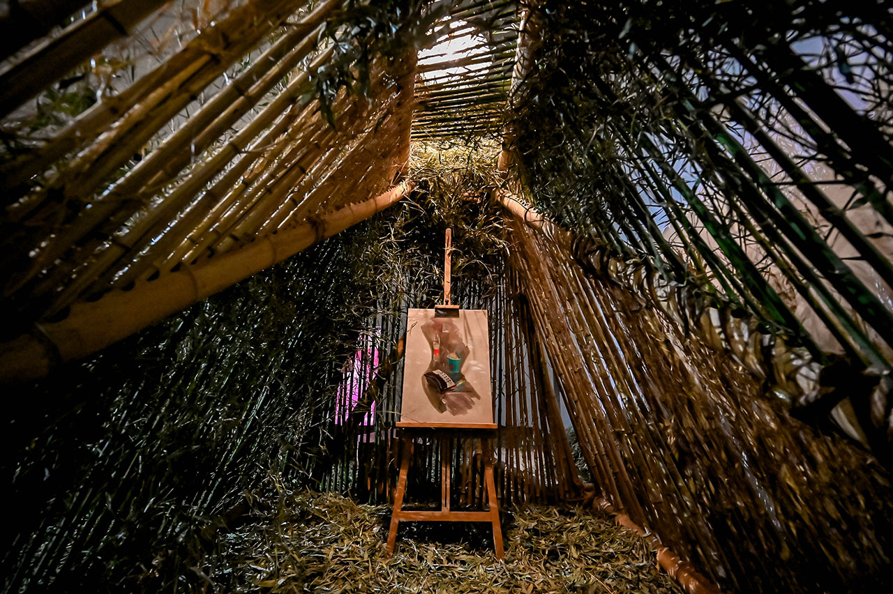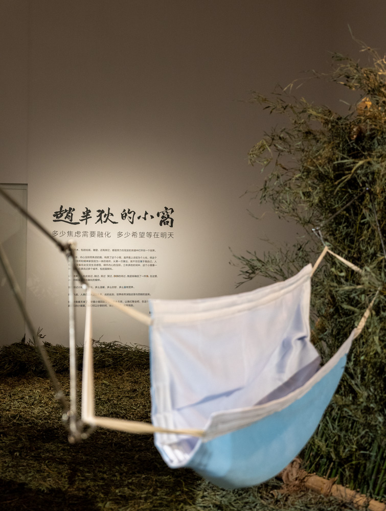 “趙半狄的小窩”由毛竹窩棚、竹葉草坪、吊床、窩棚里的小畫組成。小窩像是藝術家在大洪水中的荒島余生,安慰他自己和每一位來客。人們可以躺在吊床里休息,也可以圍坐在草坪上聊天。窩棚里是趙半狄的隱私:他有感而發時畫的小畫,經常更換。