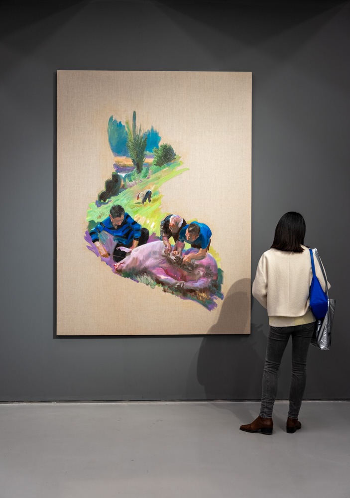 策展人杜曦云在開幕式上介紹道:“趙半狄從中央美術學院附中到中央美院油畫系整整八年,他當然熱愛繪畫。但是趙半狄熱愛繪畫,他更熱愛藝術。繪畫屬于藝術,但是藝術不只是繪畫。所以他以對畫畫的熱愛為起點,然后進入了更廣闊的對藝術的熱愛之中。所以他90年代早期的時候放下畫筆走出畫室,開始做了一系列特別特立獨行的,不能叫行為藝術,行為藝術、觀念攝影、裝置等等都有。這幾年他發起了一個著名的項目,叫做“趙半狄的小窩”,它像是一個西瓜棚一樣,毛竹搭建、竹葉草坪鋪就,還有吊床,同時小窩里還放著他的繪畫。所以這個作品很難定義,你叫它裝置,它有行為,你叫它是藝術家個人的作品,其實它是數以萬計的眾人和他一起完成的。你叫它非架上吧?窩棚里面還放著一張架上繪畫。所以我們最后只好定義它是一個互動型的、大型的、總體藝術作品。而且這個作品從2020年的11月份開始,到現在為止,之前已經走過了十一站,包括去了莫斯科?,F在是此刻是第十二站,就是回到了趙半狄的家鄉北京?!?/p>