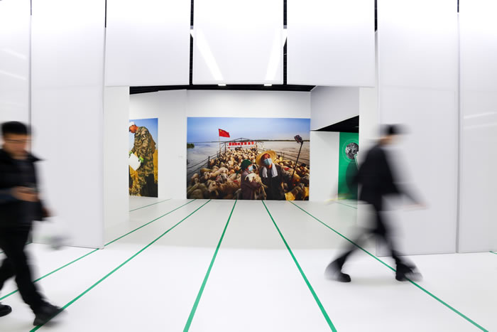 本次展覽以“感知地理”作為方法,結合世紀壇藝術中心的放射性展廳結構打造一個環狀的、多層次的展陳空間,用經緯交織的地理坐標,定位實踐現場。展場外環呈現出一百個美麗中國實踐案例,外環內側墻面上的大幅攝影以黃河、長江的流域和經濟帶為線索,呈現百姓家園建設的動人瞬間,而展場內的弧形長桌為地方政府提案、未來提案、現場工作坊的展區;內環為協作廳,展出感知地圖、實踐感知書展和案例文獻庫。