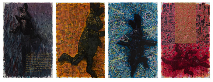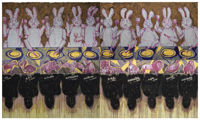 黑兔還在跑 布面丙烯、打印紙幣、金屬蕾絲 2017 陳曦