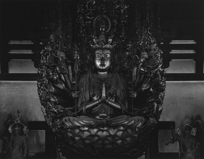 同樣充滿著東方意蘊的風味的,還有構思于1988年并最終完成于1995年的《佛之?!废盗凶髌?。作為有著豐盛的擁有欲望的收藏家,對于無法收藏的京都三十三間堂的1001尊鍍金木雕佛像,杉本博司希望以拍攝的方式來“偷取”它們。為了實現拍攝,杉本博司長達七年來向寺廟申請,最終在1995年獲批拍攝十天。拍攝期間,杉本博司關掉了寺院所有可見光,希望去掉現代電燈的干擾,用自然光源重現平安時代。如果語言說得清,藝術就沒有存在的價值了。杉本博司虔誠的拍攝過程恰似謙卑的禮佛人,只要能步入通往信仰的道路,漫長的等待也好,短暫的拍攝也罷,都無法阻擋他勢在必得的信念。